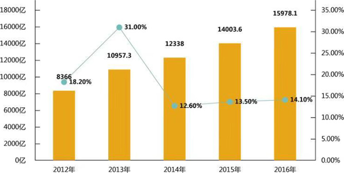 2016年全國(guó)家政市場(chǎng)規(guī)模為1.6萬億元,年增長(zhǎng)14%